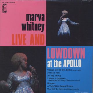 James Brownファミリーの女性シンガー、Marva Whitney!彼女が69年にリリースした、ハーレムの名門『アポロ・シアター』で行われたライブ録音!彼女の代表曲A1「Things Got To Get Better(Part I)や、A4「It's My Thing」、Aretha Franklinでもお馴染み、Otis Redding作のクラシックチューンB1「Respect」などなどをファンキーに披露!*US再発盤