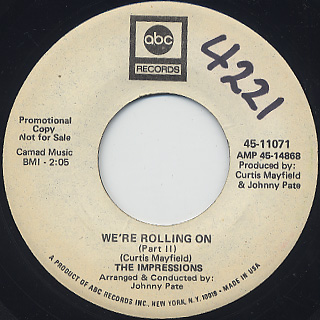 Curtis Mayfieldを中心とする、シカゴを代表するソウルグループ、The Impressionsの68年作。プロデュースはCurtis Mayfield、アレンジはJohnny Pateが担当。この時期のカーティスらしいポジティヴな勢いに溢れた、ガヤ入りのファンキーソウル!c/wにはPart2を収録。シングルオンリーの1曲です。