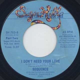 【Sugar Hill Records】からデビューした女性ラップ/ソウルトリオ、The Sequenceが82年にリリースした2nd.アルバム『The Sequence』からの7インチ。Sylvia Robinsonの息子Joey Robinson, Jr.のプロデュースで、語りから始まる80sブラコンサウンドでのスウィートソウル。c/wは泣きのギタープレイをフィーチャーしたPart 2を収録。