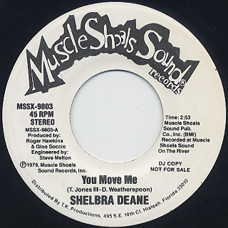 メンフィス出身の女性シンガー、Shelbra Deaneが名門スタジオ主催ながら短命に終わったレーベル【Muscle Shoals Sound Records】からリリースしたシングルオンリーの79年作。プロデュースはGino SoccioとRoger Hawkinsで、骨太なディスコ/ファンクチューンA「You Move Me」に、ドラマチックなサザンソウルB「Seeing You Again」をカップリング。