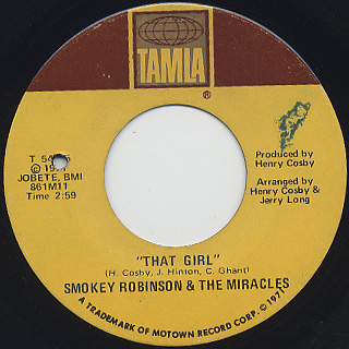 71年のアルバム『One Dozen Roses』からの7インチカット。Smokey Robinson自身作の軽やかなノーザンポップA「I Don't Blame You At All」、沁み系トランペットのイントロからSmokey印の甘酸っぱさが広がるミディアムB「That Girl」をカップリング!