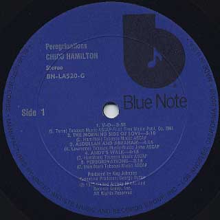 L.A.出身、コワモテのジャズドラマー、Chico Hamilton。自身のバンドを率いて、60年代より活躍する彼が75年に名門「Blue Note」よりリリースしたアルバム。グルーヴィーなベースとホーンの絡みに引き込まれるダンスジャズトラックのA1「V-O」、リムショットに絡むダークなベース、ジワジワと絡むピアノやギター、メロウなコーラス等で気持ち良くなるA2「The Morning Side Of Love」、アラビックな雰囲気を持った演奏にクラップが小気味良く鳴るA3「Abdullah And Abraham」等、様々な要素を取り込みつつも一環してクールに仕上げた1枚!*Blue Note青ベタ黒音符ラベル