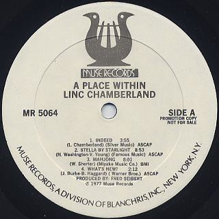 コネチカット出身のギタリスト、Linc Chamberlandが77年に【Muse】からリリースした1st.アルバム。モーダルを軸にテクニカルな絡みが展開されるA1「Indeed」、サックスとギターがインプロを交えて掛け合うようなA3「Mahjong」、疾走感あるモーダル・ジャズファンクB1「A Place Within」等、ピリっとシブいフリー手前のジャズを披露。*裏ジャケット表紙ズレ