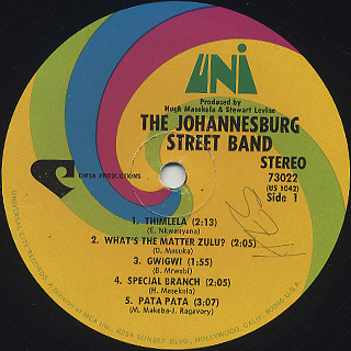 Hugh Masekelaがプロデュースを手掛けた、南アフリカ・ヨハネスブルグのインスト・バンド、The Johannesburg Street Bandが68年に残した唯一のアルバム。伸び伸びとホーンが響くインスト・ハイライフ/アフロソウルA1「Thimela」を始め、Miriam Makebaのヴァージョンでも知られるA5「Pata Pata」、陽気なホーン隊が掛け合うB4「Foyi-Foyi」、ギターとフルートが絡む牧歌的なB5「Ntyilo-Ntyilo」まで。