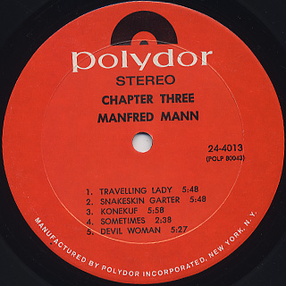 UK発、Manfred Mannを中心としたジャズ・ロック〜プログレッシヴ・ロックバンド、Manfred Mann Chapter Threeの69年作。グッと腰を落としたヘヴィーなサイケ〜ジャズ・ロックA1「Travelling Lady」を始め、ベースの効いたイントロブレイクからして好き者なら間違いないA2「Snakesking Garter」、CormegaネタのスロウにハメるB1「Time」、高らかに鳴るホーンが高揚感を煽るB2「One Way Glass」等、ブレイク〜サンプリング好きにオススメの1枚です。