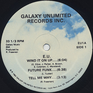 Experience Unlimited名義でリリースした1st.アルバムがレアグルーヴ/ファンク名盤として知られるワシントンDCのゴーゴー/ファンクバンド。E.U.名義でリリースした82年作。小気味良いビートのゴーゴートラックA1「Wind It On Up」、ちょっぴりアーバンさを持ったA2「Future Funk」、SideBをまるまる使ったライブ録音のゴキゲンな「Crankin' At The Go Go」まで、弾んだビートが満載です。