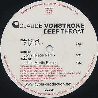 サンフランシスコの良質エレクトロレーベル【Dirtybird】作品でお馴染みのClaude VonStrokeがフランスのダンスミュージックレーベル【Electrochoc】から2006年にリリースした本作は、ゲップをサンプリングした世界的フロア・ヒット!!歪んだベースがかっこいいルーディなエレクトロヴァージョンB1「Deep Throat (John Tejada Remix)」、テックハウスB2「Deep Throat (Justin Martin Remix)」は45回転で音圧太しです!